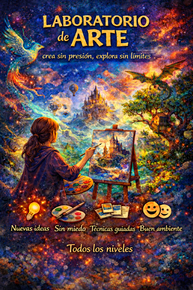 El Laboratorio de Arte es un espacio creativo abierto, pensado para que puedas experimentar, probar ideas nuevas y disfrutar del proceso, sin miedo a equivocarte y sin la presión de un curso tradicional.